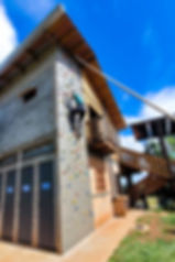 Uma escalada externa na sede do Eco Park, com vias artificiais de diferentes níveis de dificuldade.
